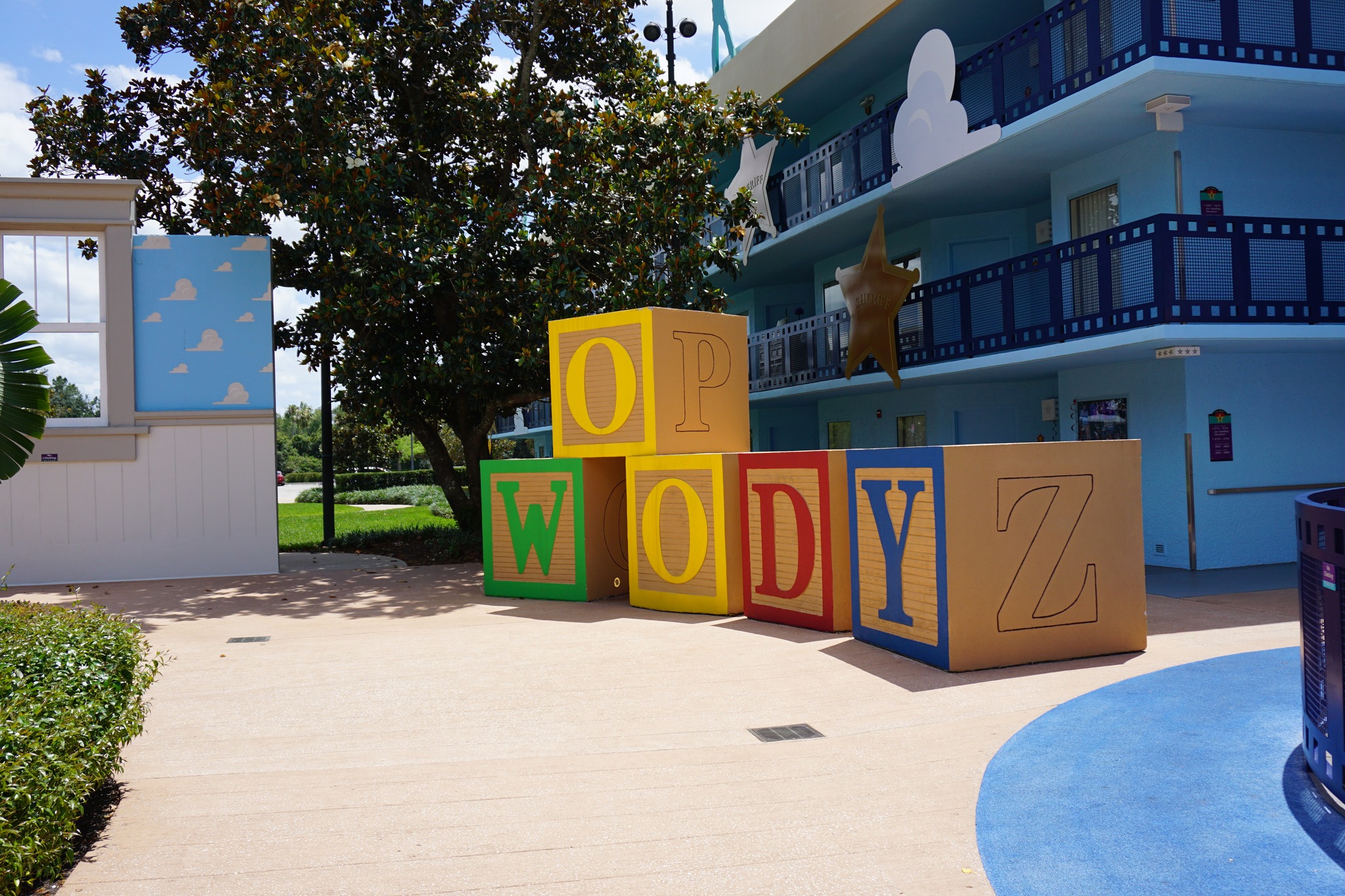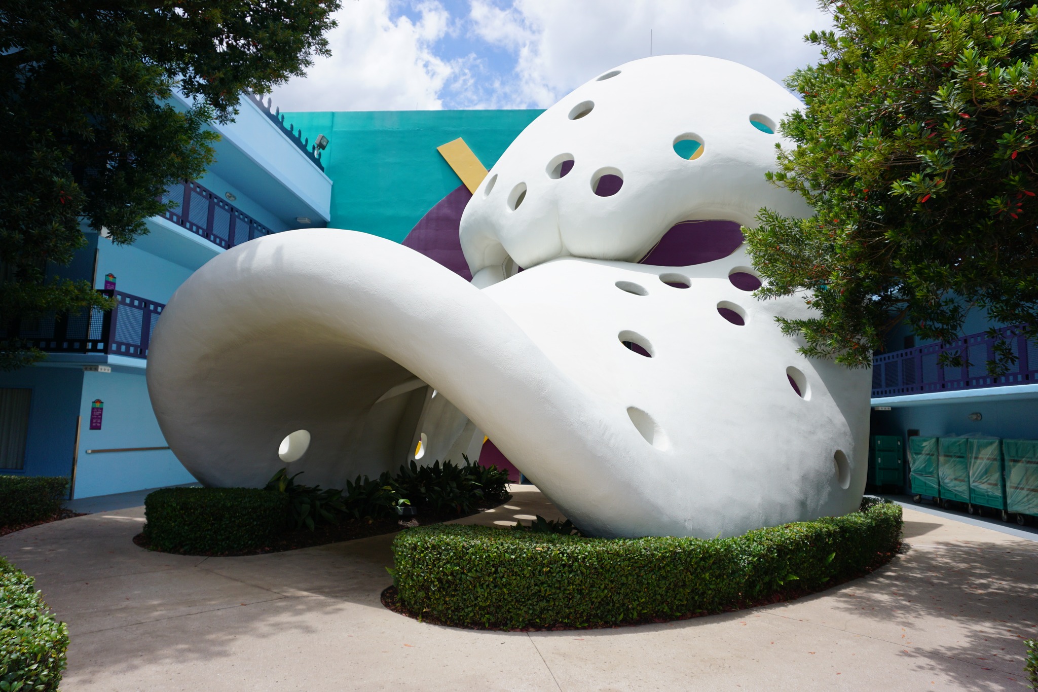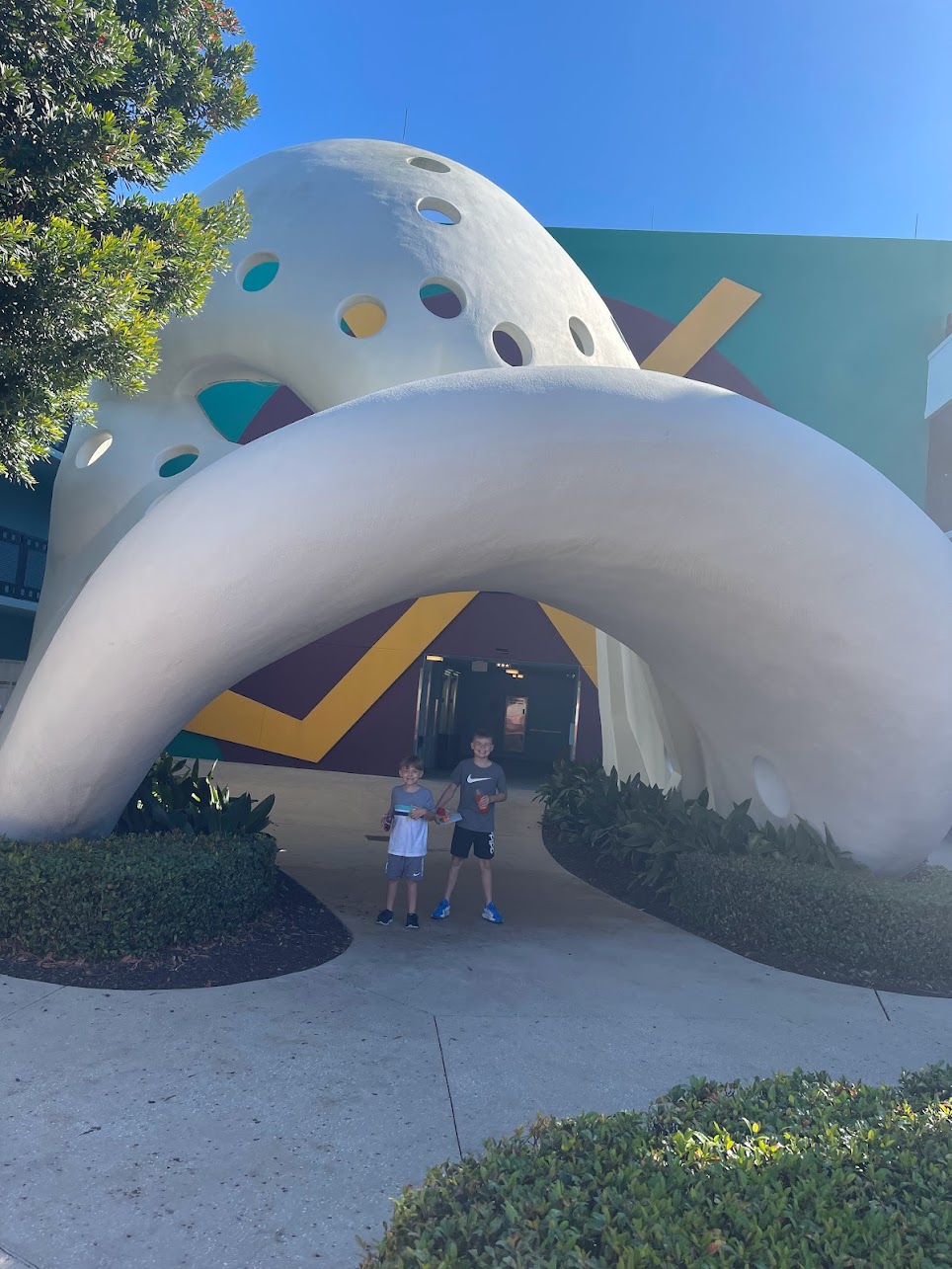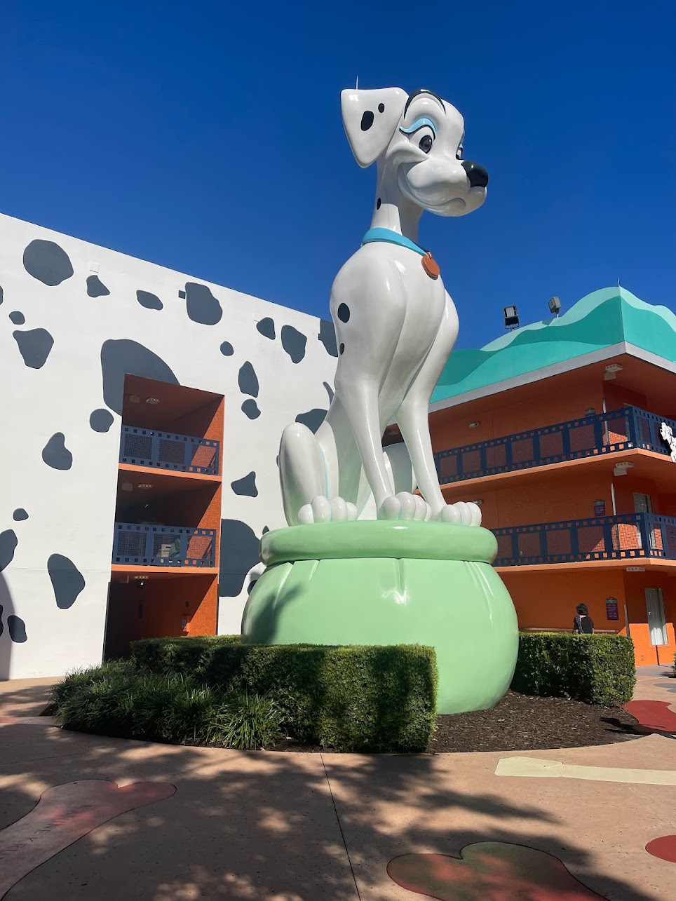 All Star Movies is one of five resorts in the Value Category at Walt Disney World, and one of three in the All-Star family. This resort though is by far my favorite with the theming. It’s like a magical playground with 5 themed zones, each boasting gigantic statues straight out of beloved Disney flicks! We’ve got the delightful 101 Dalmatians, the whimsical Fantasia, the sporty Mighty Ducks, the lovable Herbie The Love Bug, and my personal fave, Toy Story! These statues are perfect for snapping epic pics, whether you’re a kid or just a kid at heart! We were lucky enough to be in the Mighty Ducks area, and let me tell you, strutting through that giant mask every morning was a blast! Strolling through the 101 Dalmatians section? Pure joy, and it made the trek to our room feel like a breeze!