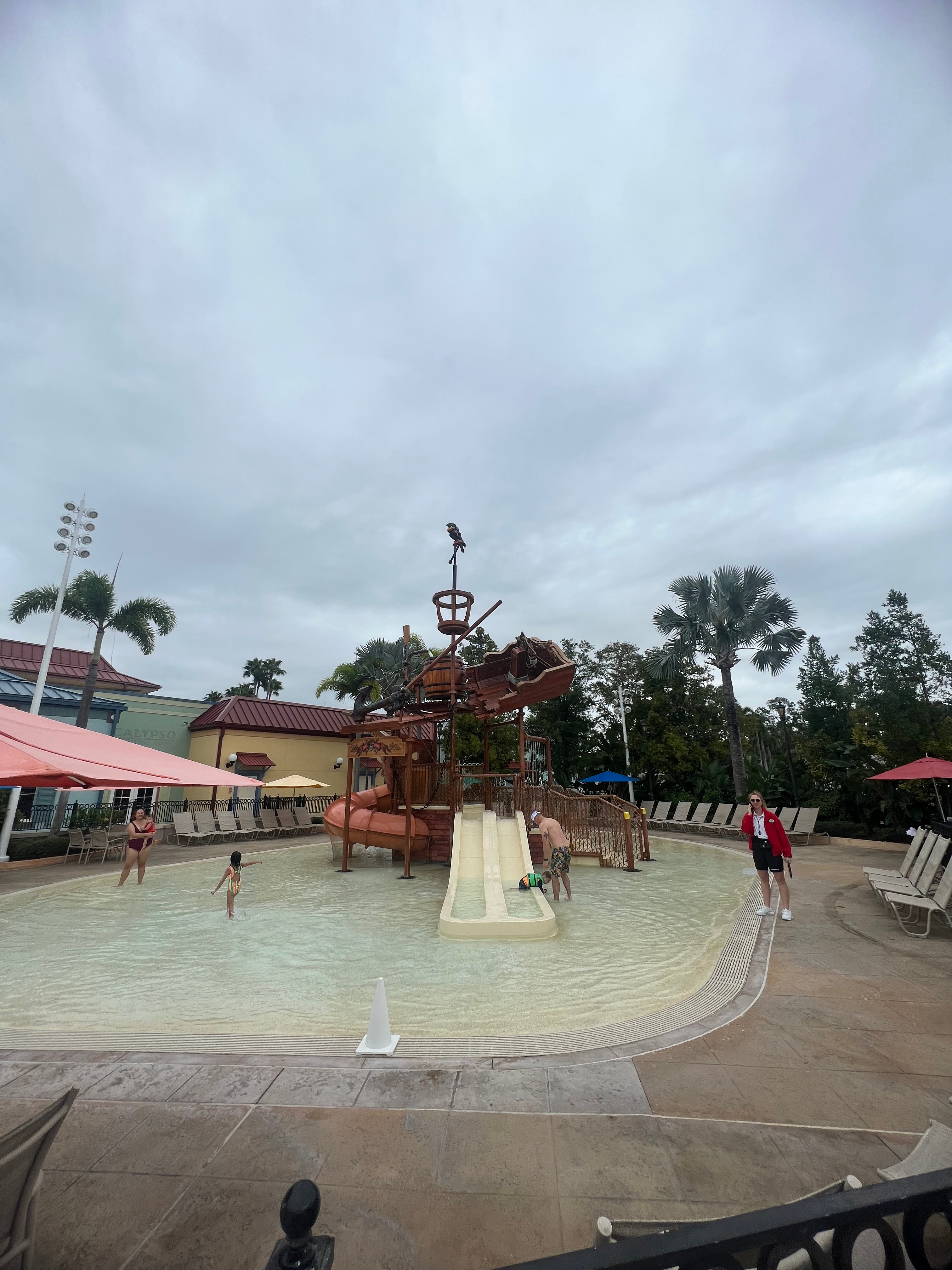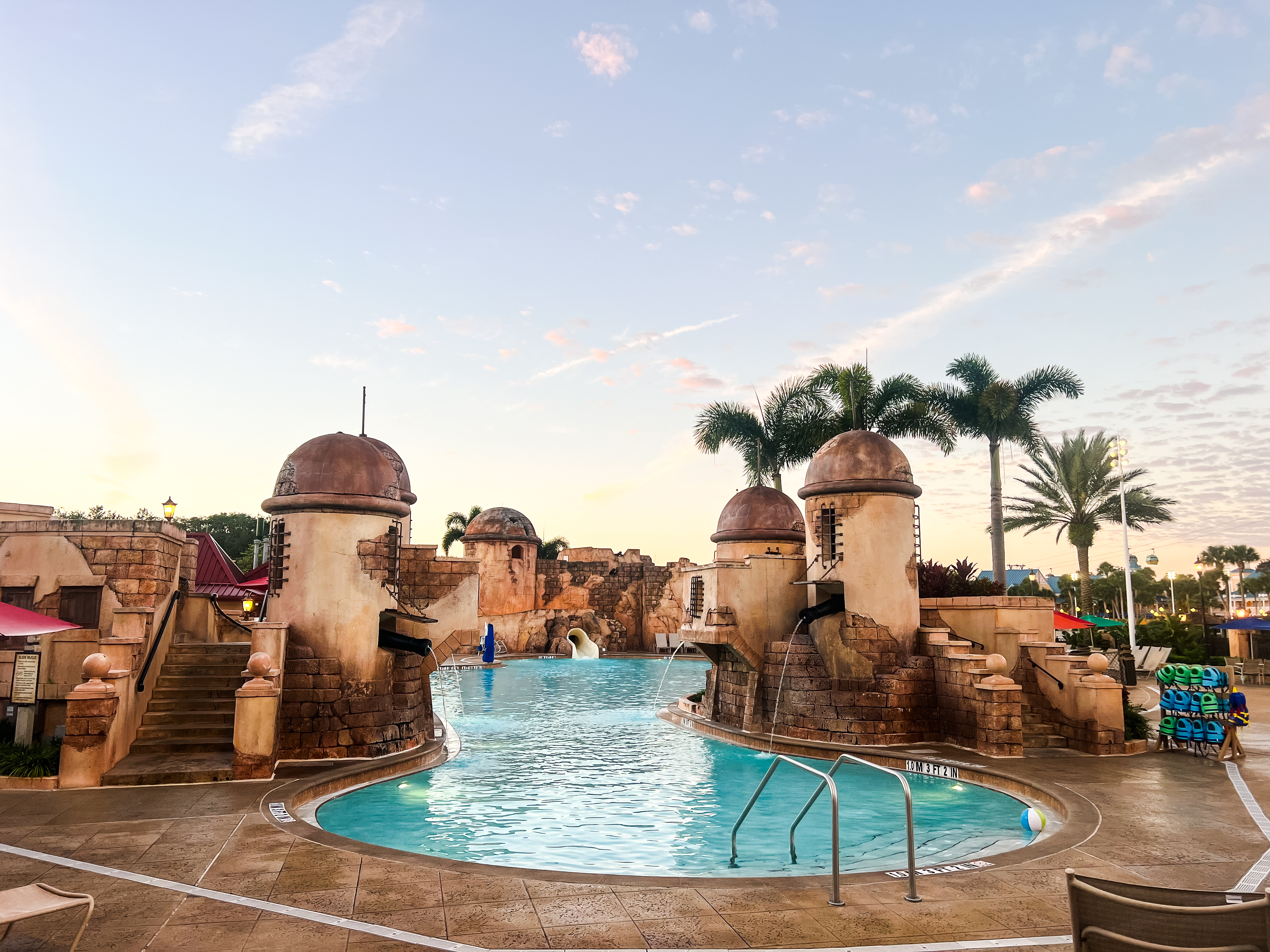 Caribbean Beach Resort is also unique because of its layout. The resort is divided into five colorful “villages” — Barbados, Jamaica, Martinique, Trinidad, and Aruba — each with its own quiet pool and beautiful landscaping. It feels like you’re tucked away in your own little island neighborhood, yet you’re still just a short stroll (or internal shuttle ride) from Old Port Royale, the main hub for dining, shopping, and the feature pool. Of course, we can’t talk about Caribbean Beach without mentioning the pool. The Fuentes del Morro Pool, with its old Spanish fort theming, is hands down one of our kids’ favorite places to spend a day. With water slides, splash areas, and plenty of space for lounging, it’s the perfect mix of fun and relaxation. We love being able to spend a “resort day” here without feeling like we’re missing out on the Disney magic because the pool area itself feels like an attraction.